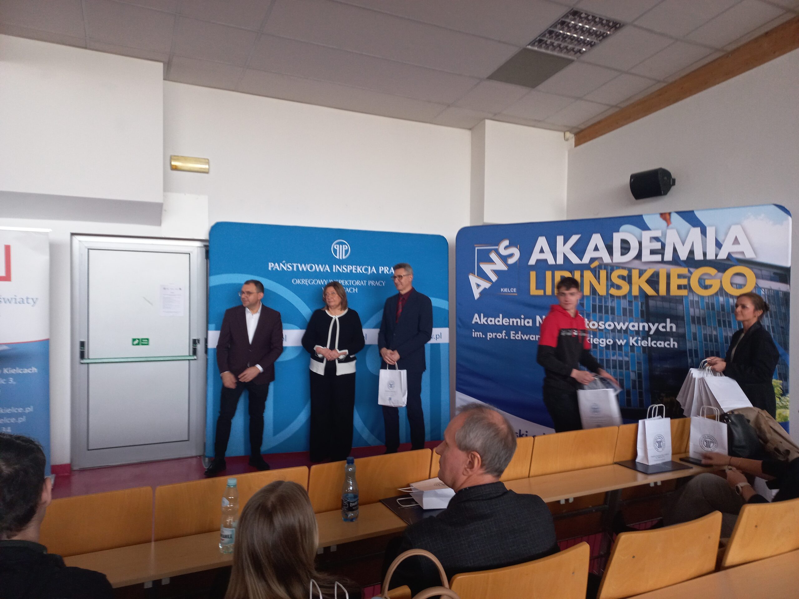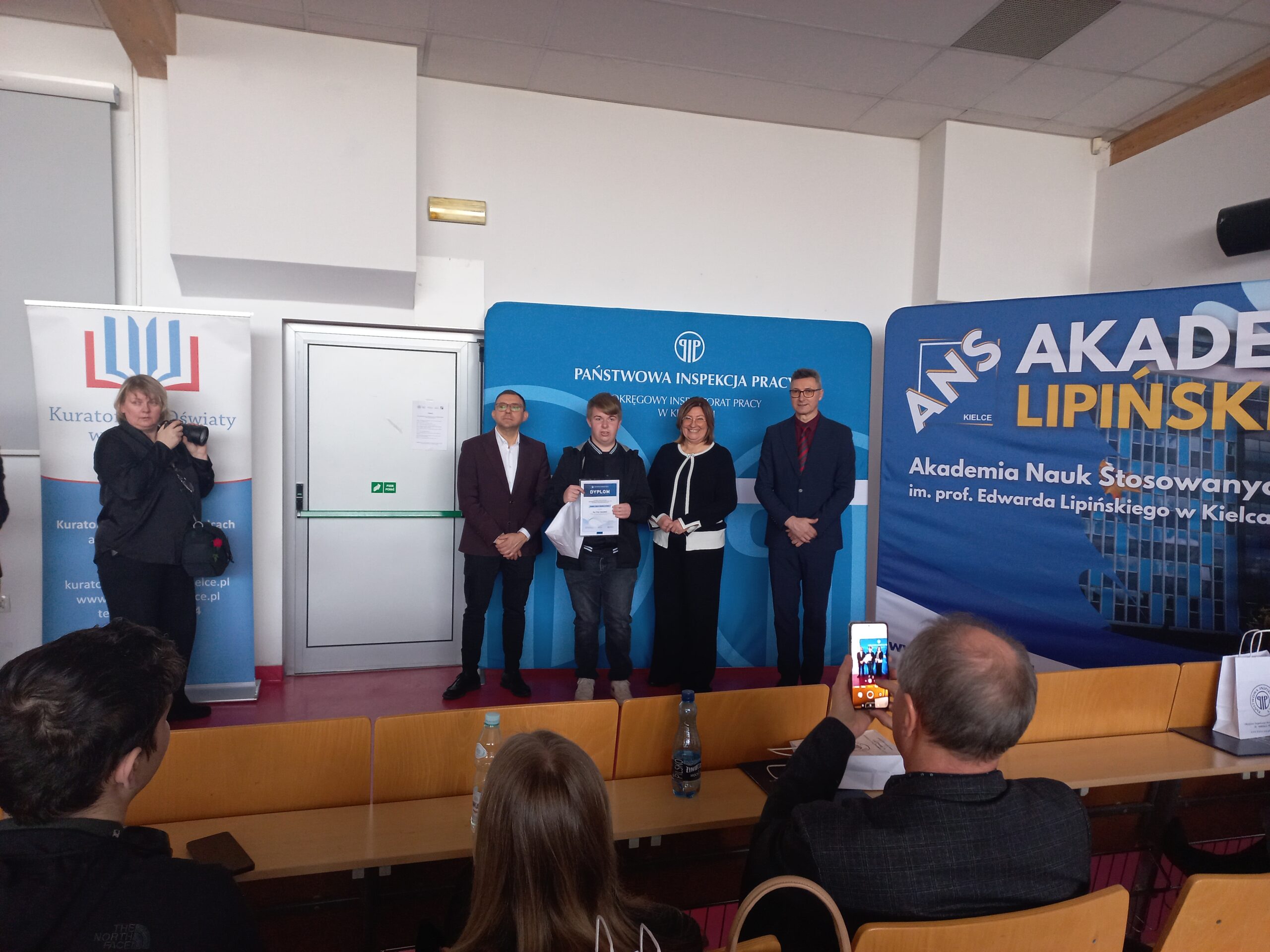 We wtorek 10 marca odbył się regionalny etap ogólnopolskiego konkursu organizowanego przez Państwową Inspekcję Pracy pod nazwą „Poznaj swoje prawa w pracy”. Konkurs został przeprowadzony w auli Akademii Nauk Stosowanych im. prof. Edwarda Lipińskiego w Kielcach. Naszą szkołę reprezentowali, uczniowie Jakub Baran klasy IVTR oraz Piotr Ciesielski ITR, którzy wcześniej wygrali etap szkolny tego konkursu.