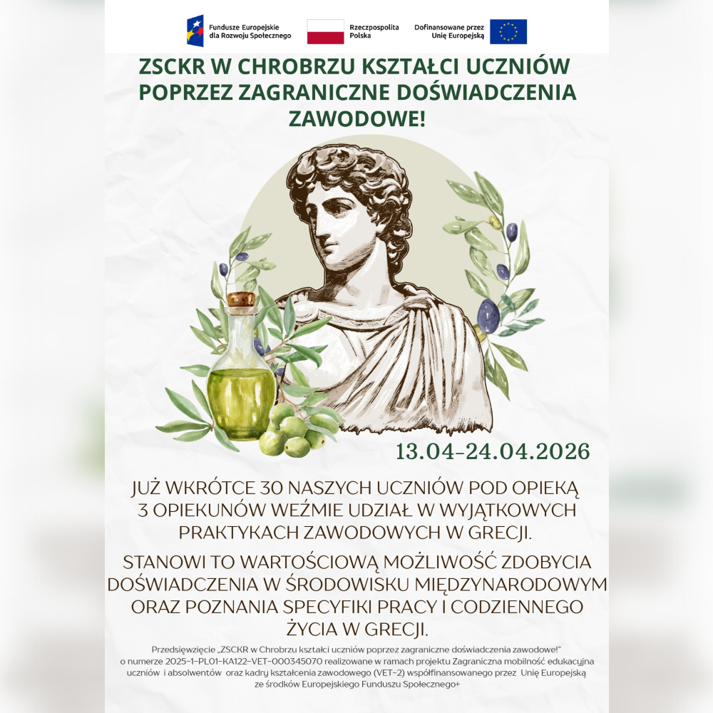 Home » Aktualności » Projekt – „ZSCKR w Chrobrzu kształci uczniów poprzez zagraniczne doświadczenia zawodowe”.